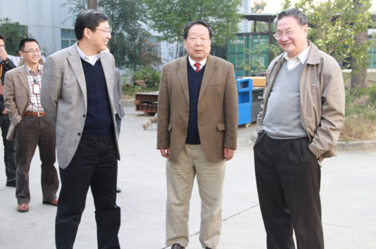 院士参观激光动态弯沉测量系统(从左至右公司首席科学家、武汉大学常务副校长李清泉先生陪同中国工程院和中国科学院双院士李德仁先生、中国科学院院士许厚泽先生)